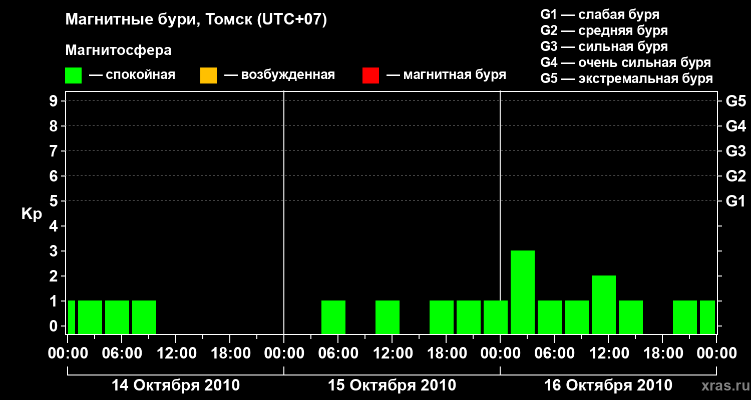 Изменения геомагнитного индекса Kp с 14 по 16 октября 2010 года для средних широт