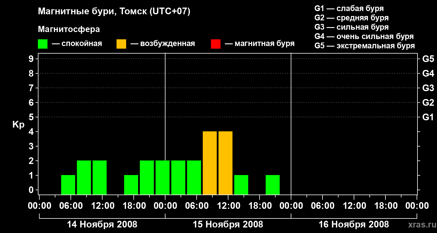 Изменения геомагнитного индекса Kp с 14 по 16 ноября 2008 года для средних широт
