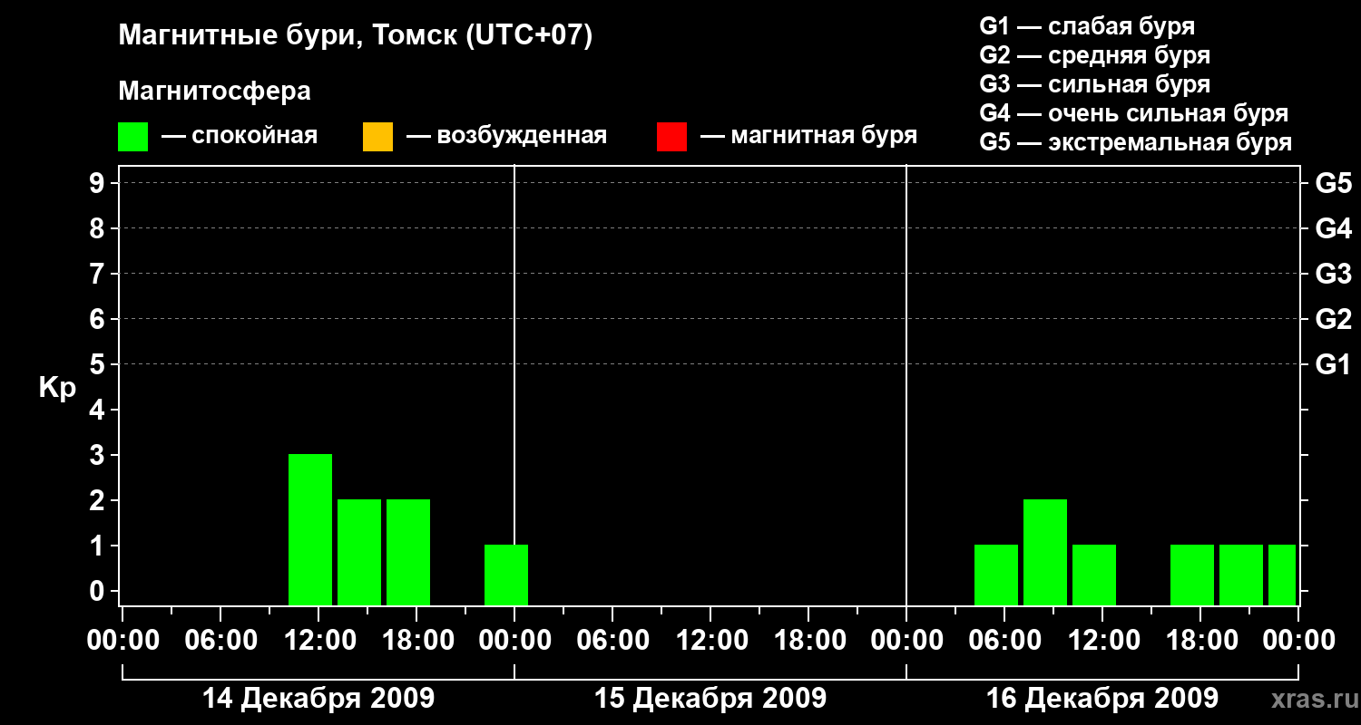Изменения геомагнитного индекса Kp с 14 по 16 декабря 2009 года для средних широт