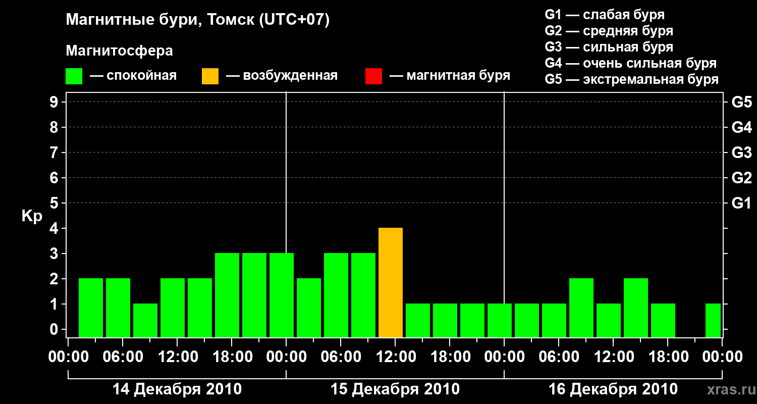 Изменения геомагнитного индекса Kp с 14 по 16 декабря 2010 года для средних широт