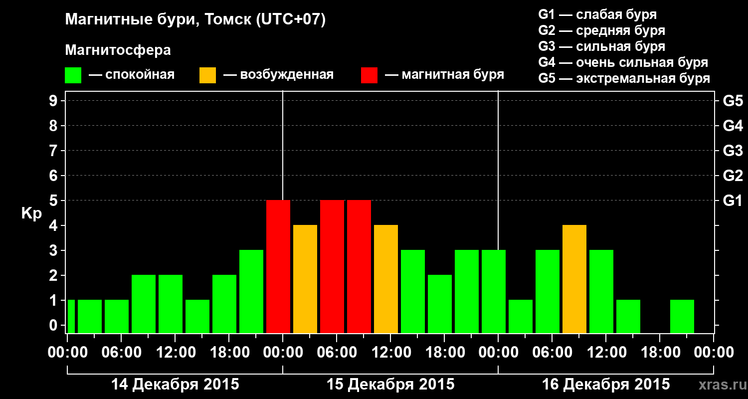 Изменения геомагнитного индекса Kp с 14 по 16 декабря 2015 года для средних широт