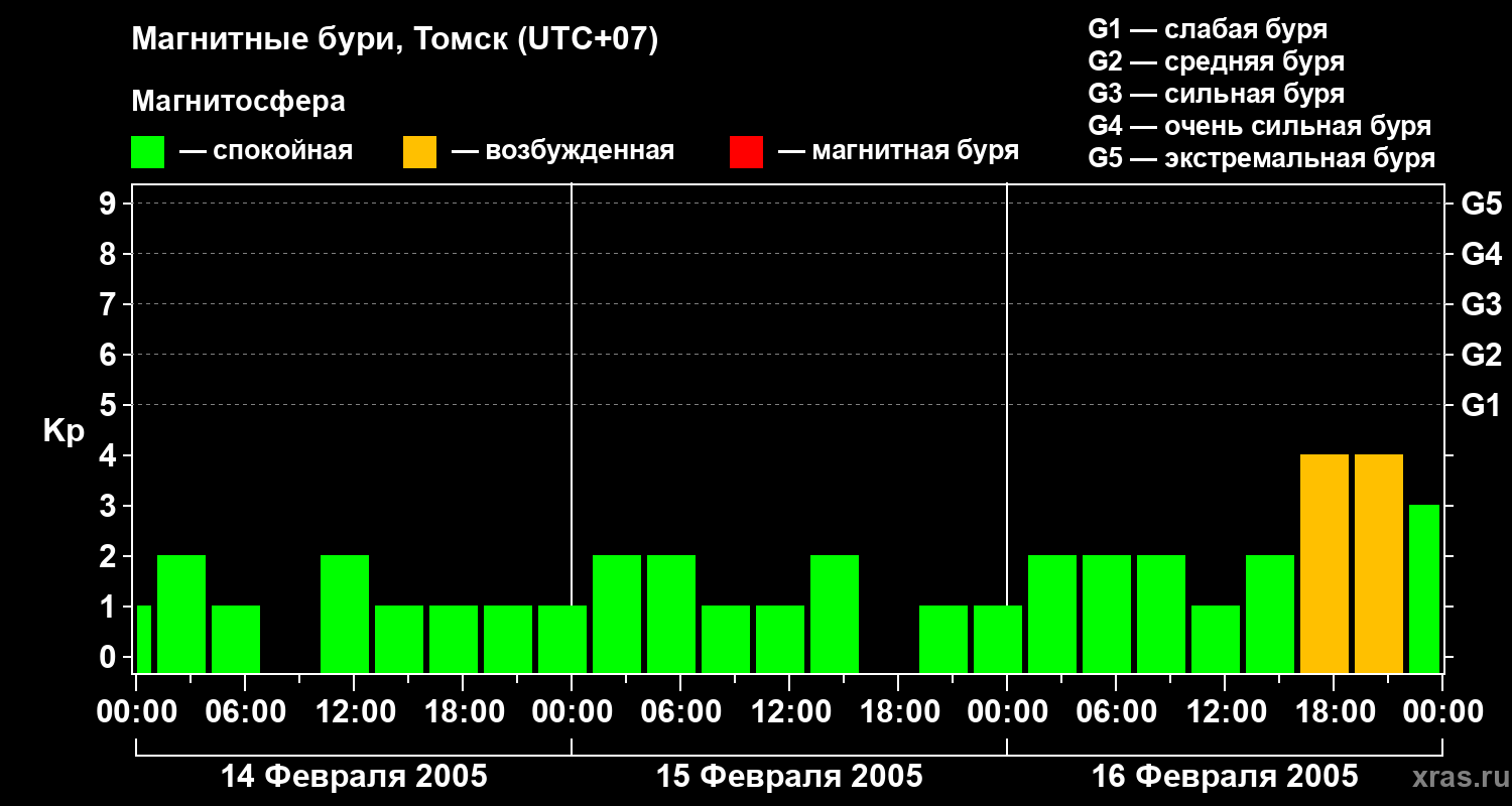 Изменения геомагнитного индекса Kp с 14 по 16 февраля 2005 года для средних широт