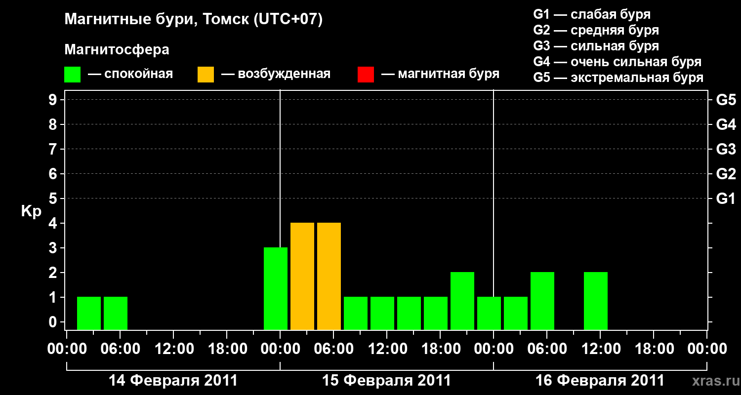 Изменения геомагнитного индекса Kp с 14 по 16 февраля 2011 года для средних широт