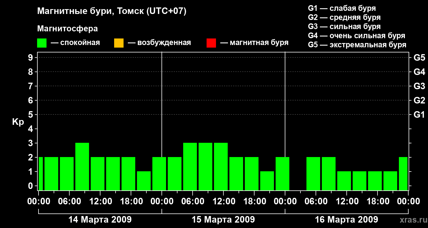 Изменения геомагнитного индекса Kp с 14 по 16 марта 2009 года для средних широт