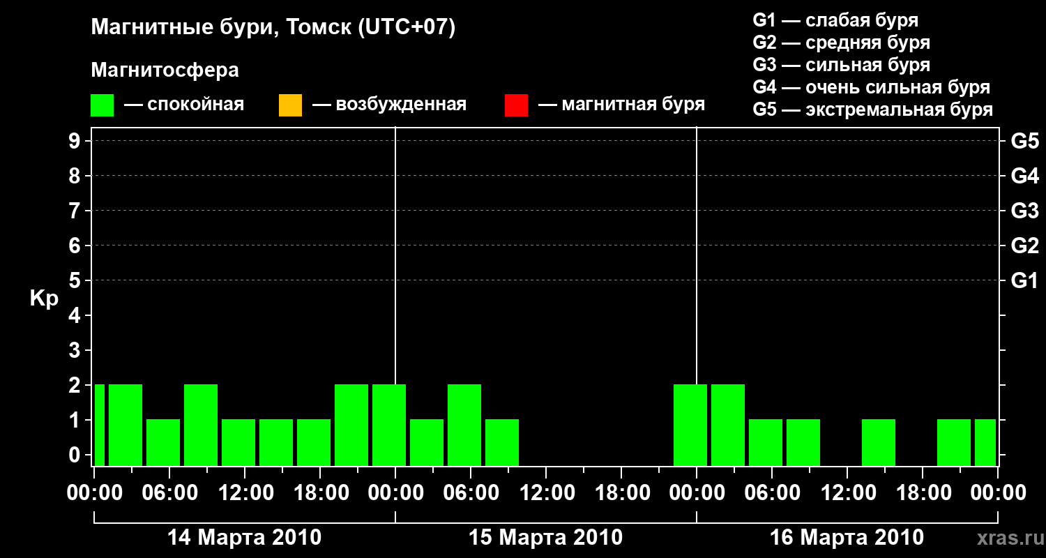 Изменения геомагнитного индекса Kp с 14 по 16 марта 2010 года для средних широт