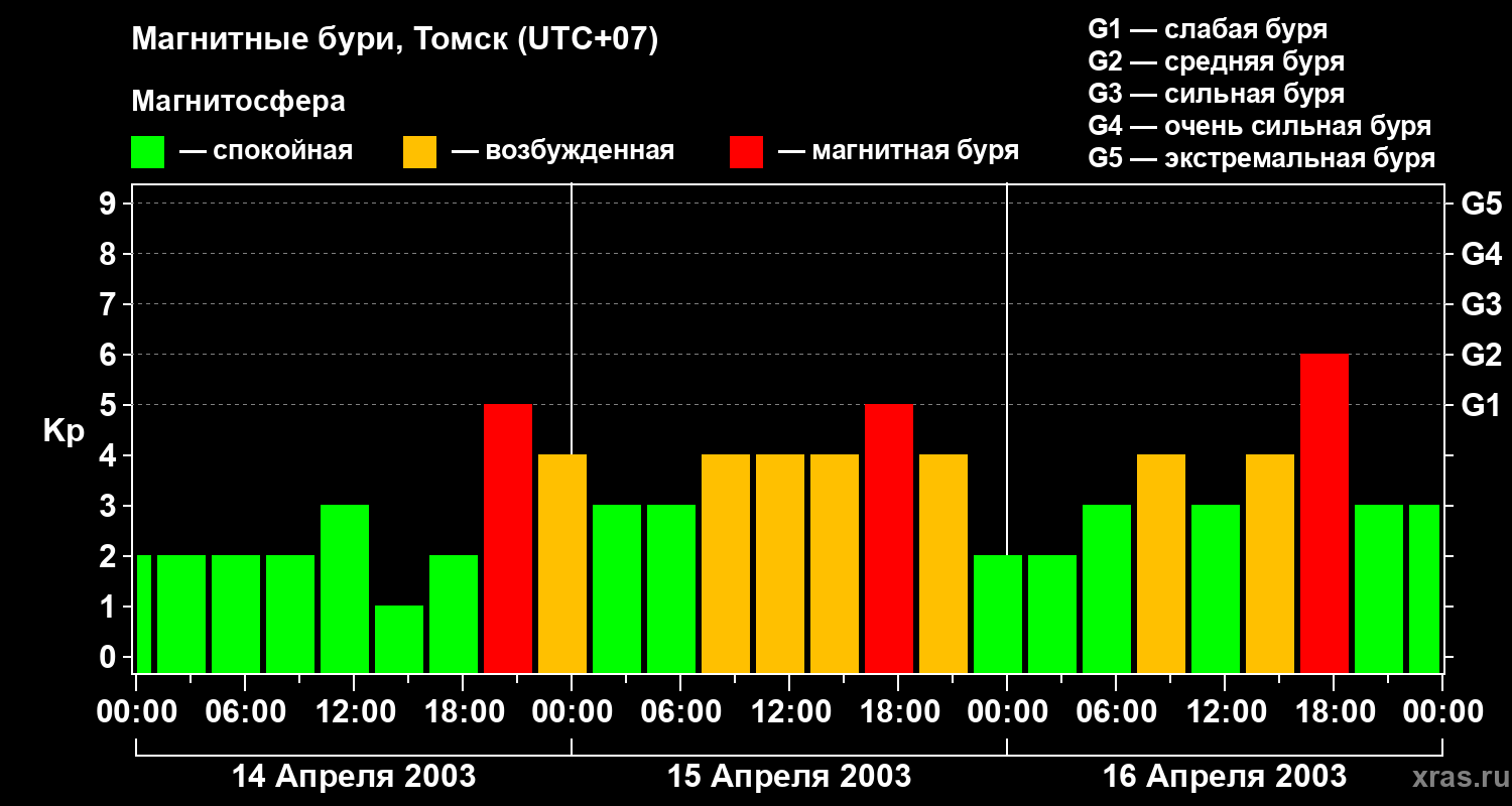Изменения геомагнитного индекса Kp с 14 по 16 апреля 2003 года для средних широт