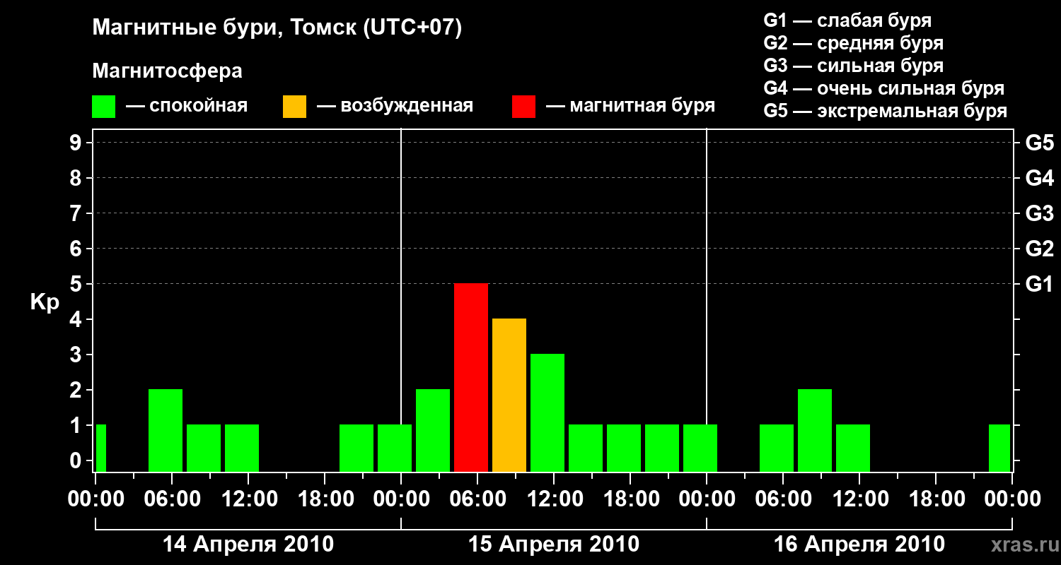 Изменения геомагнитного индекса Kp с 14 по 16 апреля 2010 года для средних широт
