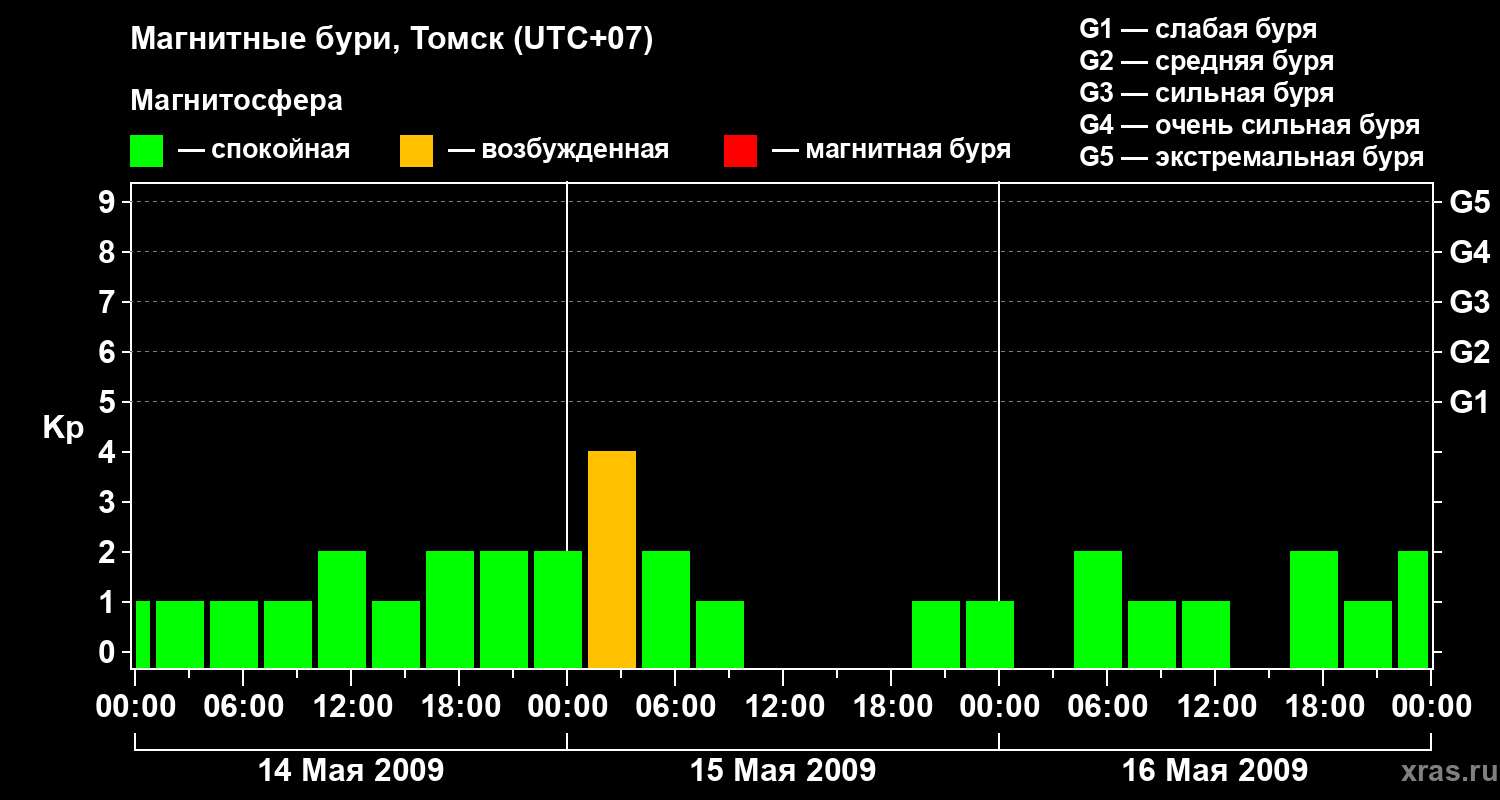 Изменения геомагнитного индекса Kp с 14 по 16 мая 2009 года для средних широт