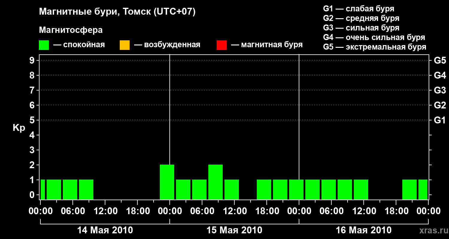 Изменения геомагнитного индекса Kp с 14 по 16 мая 2010 года для средних широт