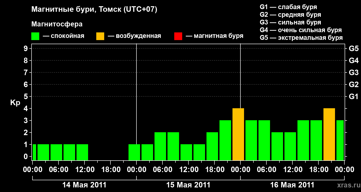 Изменения геомагнитного индекса Kp с 14 по 16 мая 2011 года для средних широт
