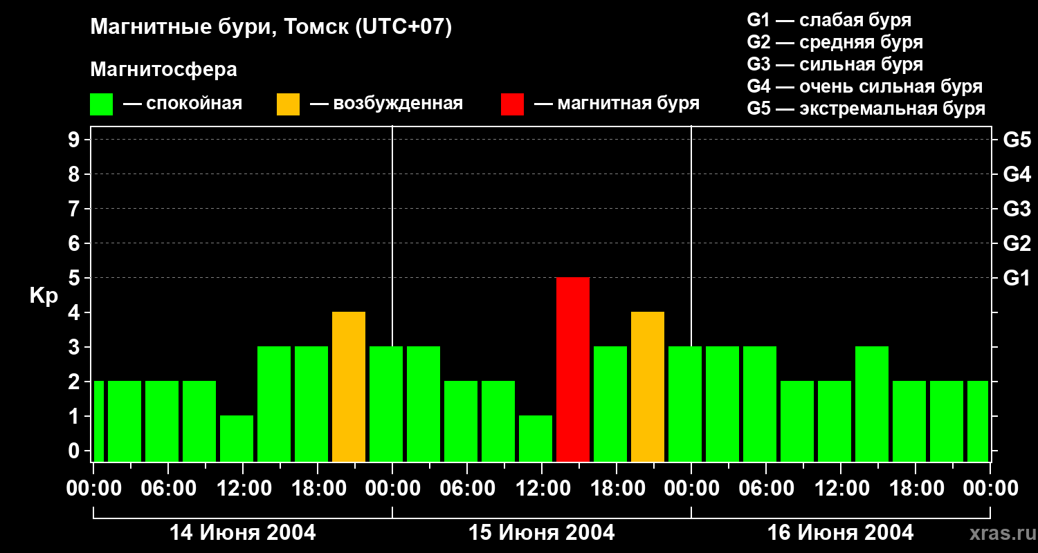 Изменения геомагнитного индекса Kp с 14 по 16 июня 2004 года для средних широт