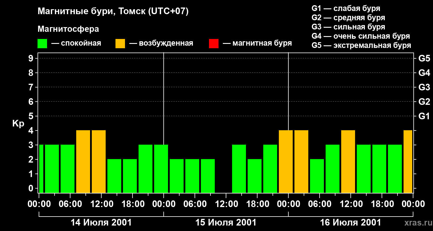 Изменения геомагнитного индекса Kp с 14 по 16 июля 2001 года для средних широт
