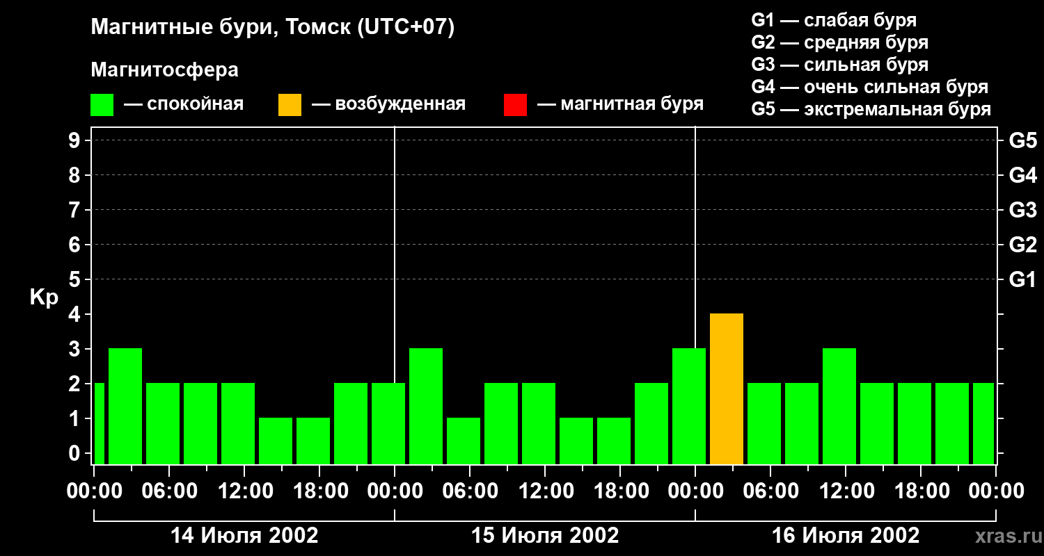 Изменения геомагнитного индекса Kp с 14 по 16 июля 2002 года для средних широт