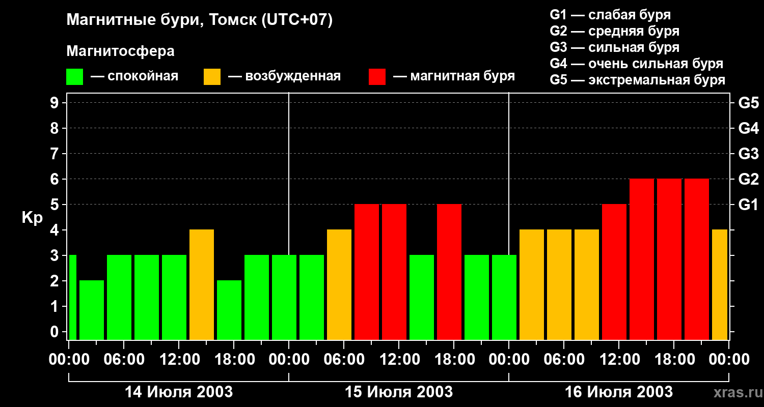 Изменения геомагнитного индекса Kp с 14 по 16 июля 2003 года для средних широт