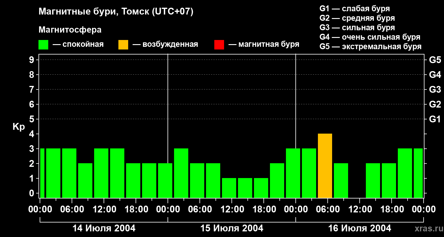 Изменения геомагнитного индекса Kp с 14 по 16 июля 2004 года для средних широт