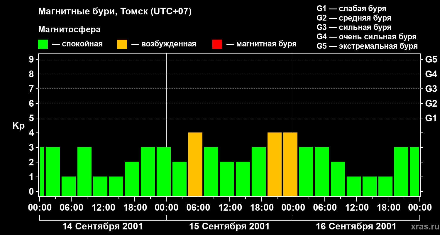 Изменения геомагнитного индекса Kp с 14 по 16 сентября 2001 года для средних широт