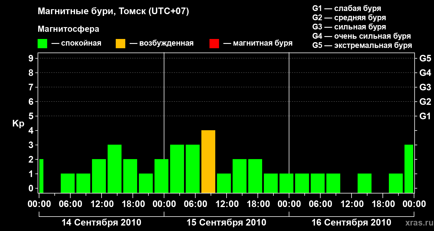 Изменения геомагнитного индекса Kp с 14 по 16 сентября 2010 года для средних широт