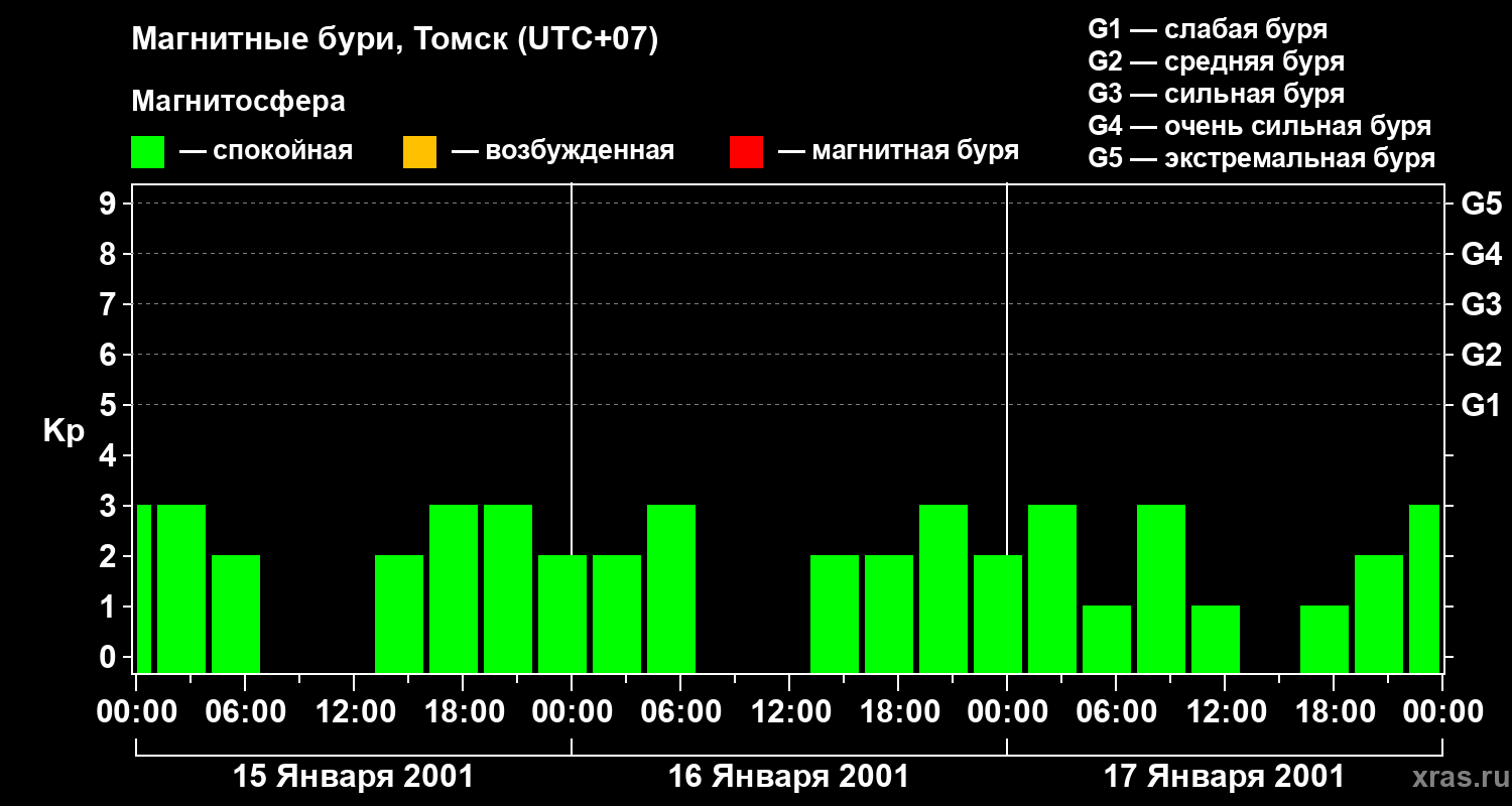 Изменения геомагнитного индекса Kp с 15 по 17 января 2001 года для средних широт