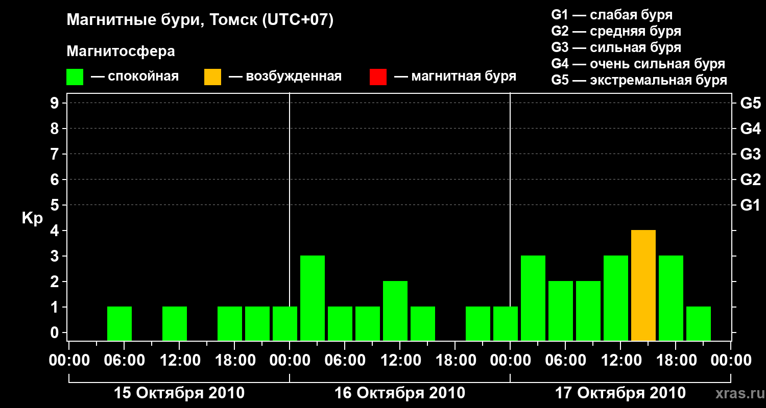 Изменения геомагнитного индекса Kp с 15 по 17 октября 2010 года для средних широт
