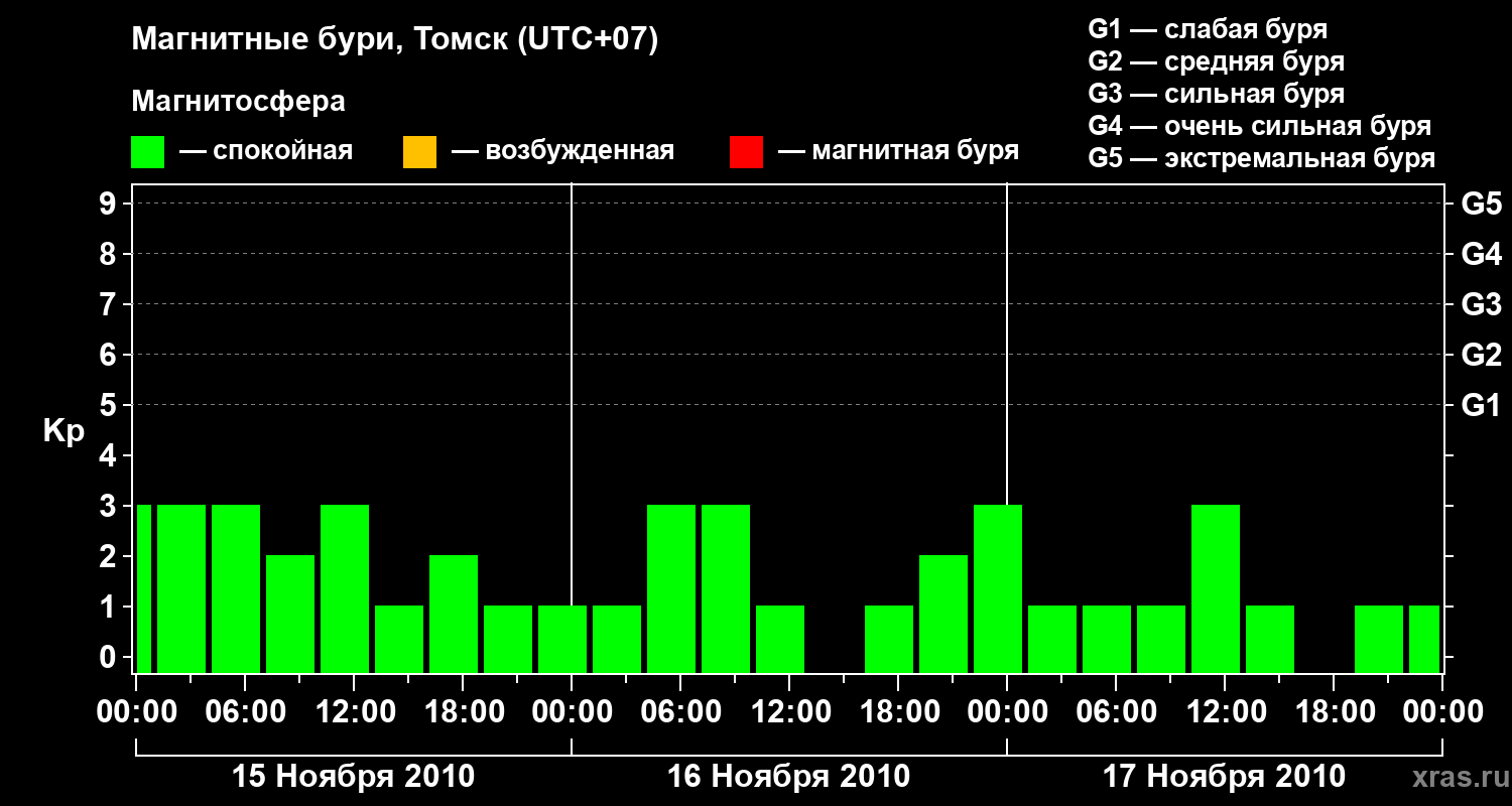 Изменения геомагнитного индекса Kp с 15 по 17 ноября 2010 года для средних широт