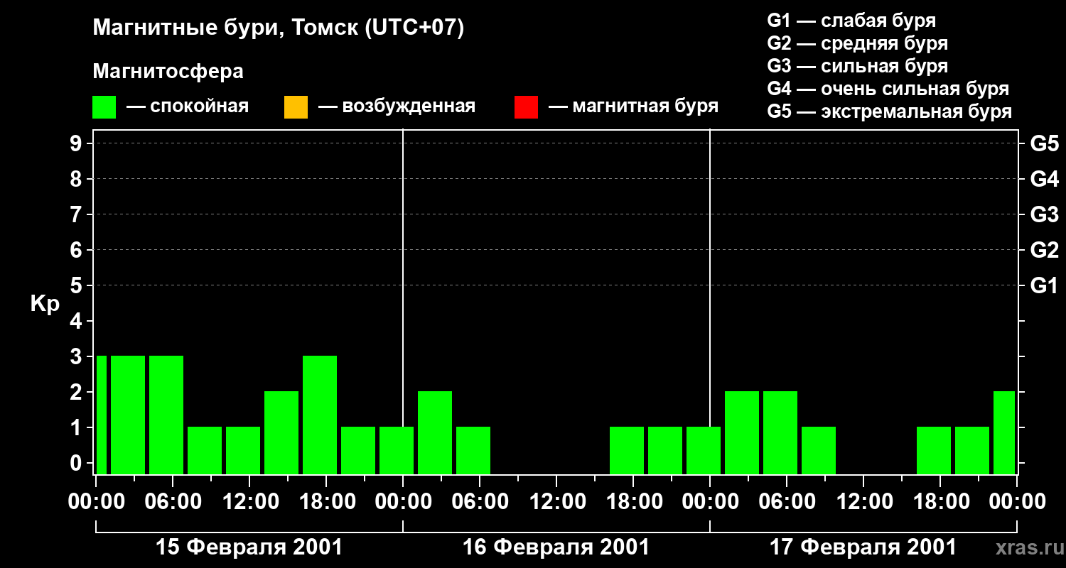Изменения геомагнитного индекса Kp с 15 по 17 февраля 2001 года для средних широт