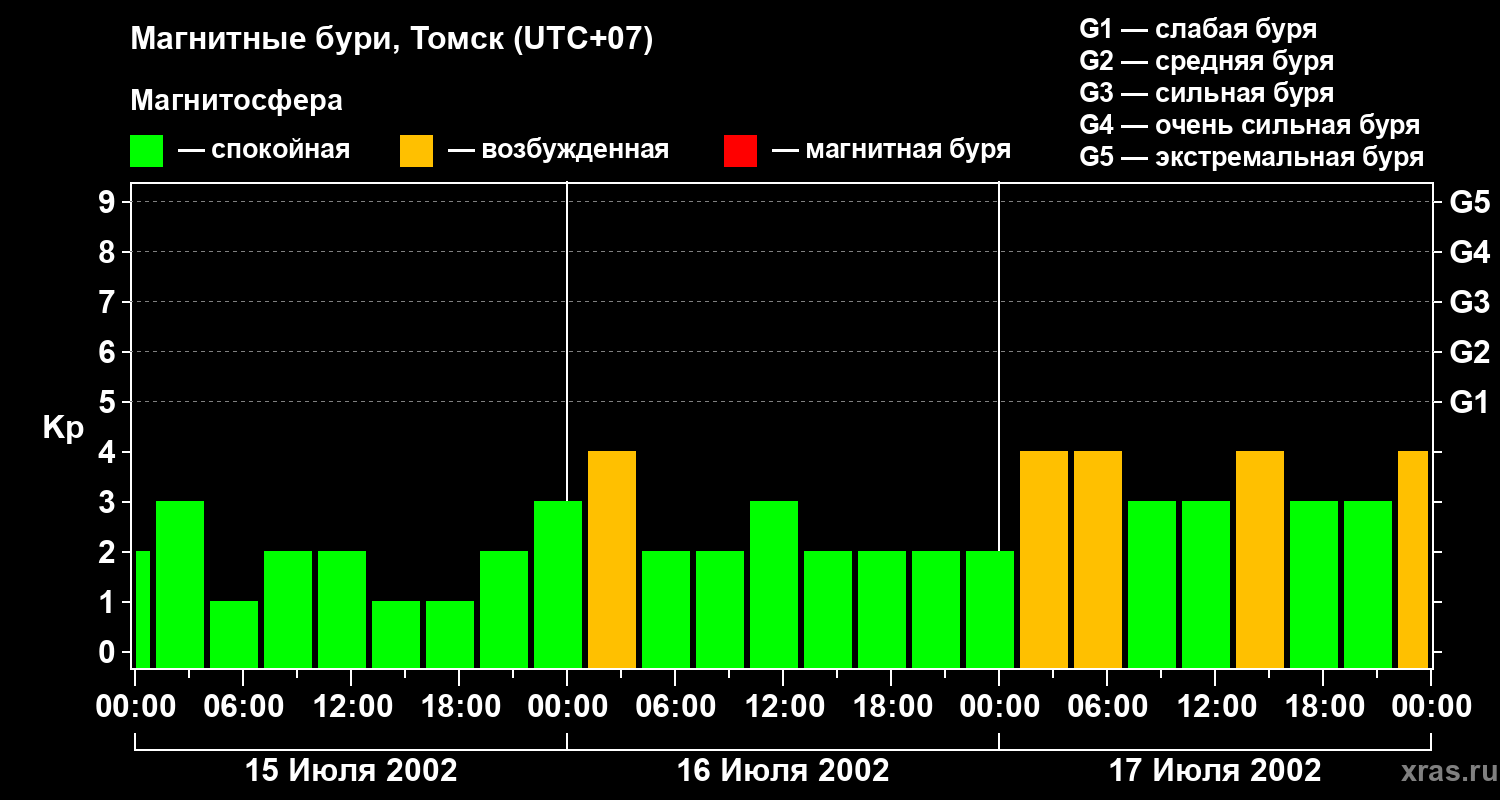Изменения геомагнитного индекса Kp с 15 по 17 июля 2002 года для средних широт