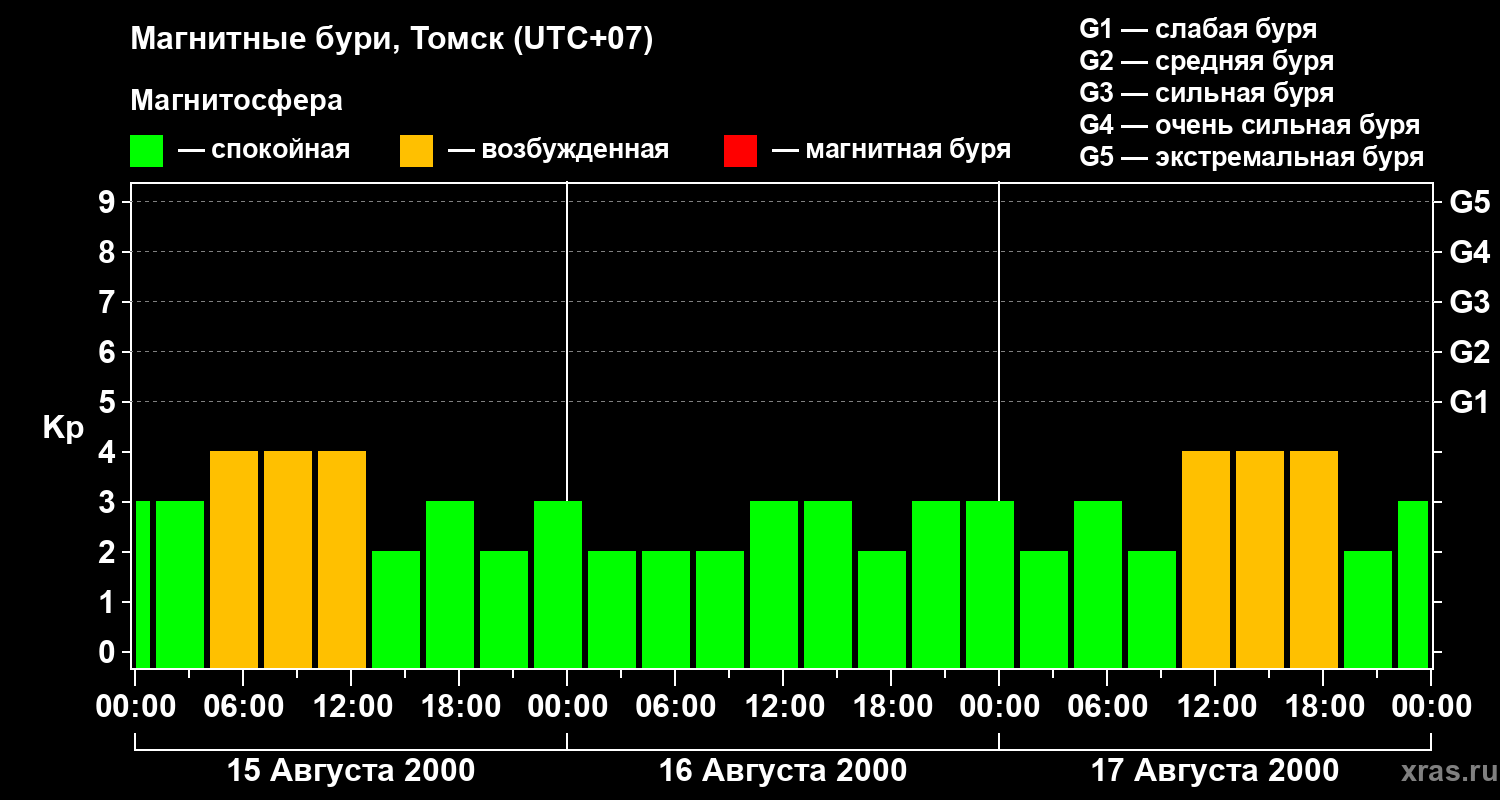 Изменения геомагнитного индекса Kp с 15 по 17 августа 2000 года для средних широт