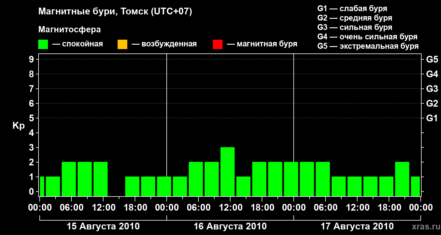Изменения геомагнитного индекса Kp с 15 по 17 августа 2010 года для средних широт