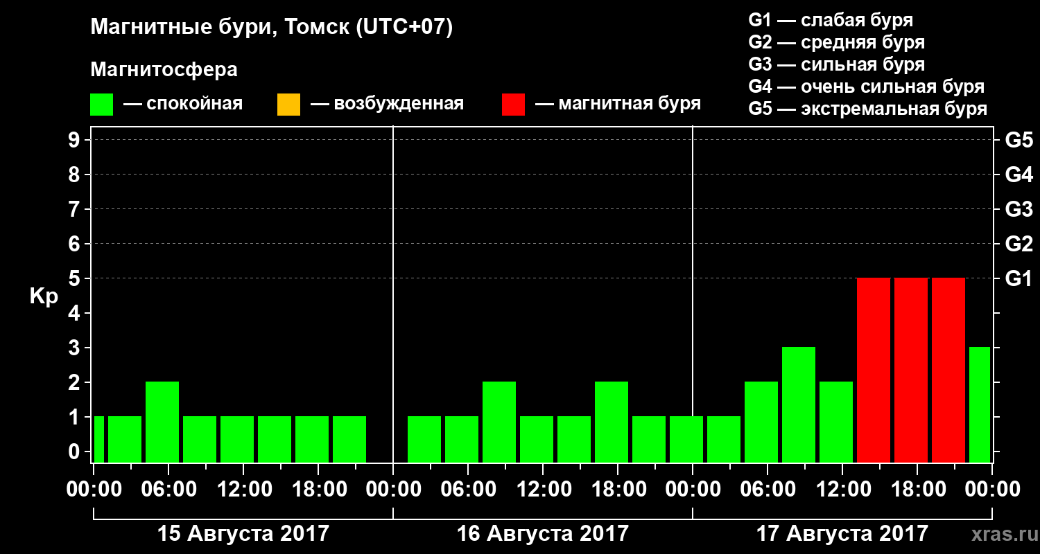 Изменения геомагнитного индекса Kp с 15 по 17 августа 2017 года для средних широт