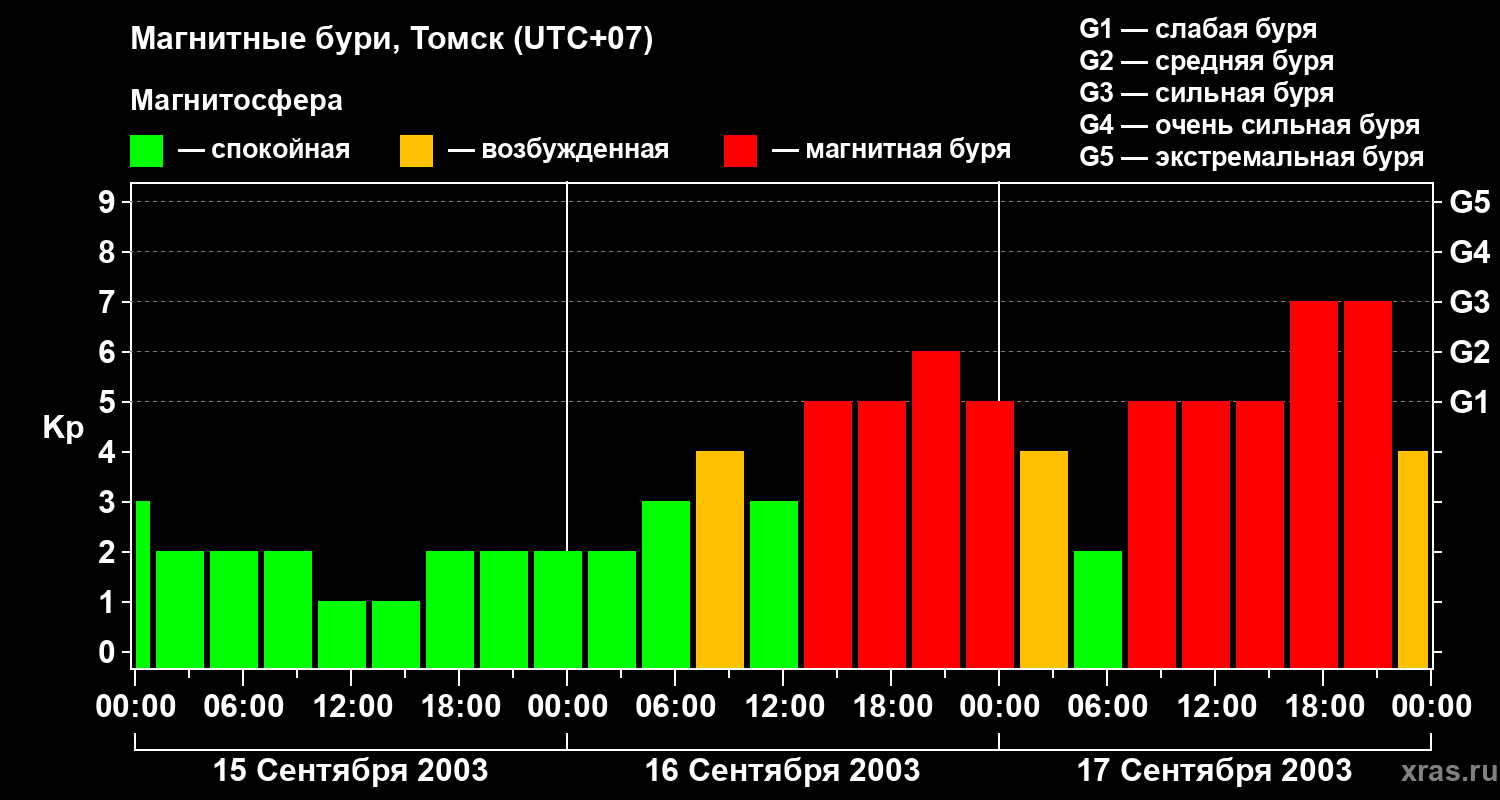 Изменения геомагнитного индекса Kp с 15 по 17 сентября 2003 года для средних широт