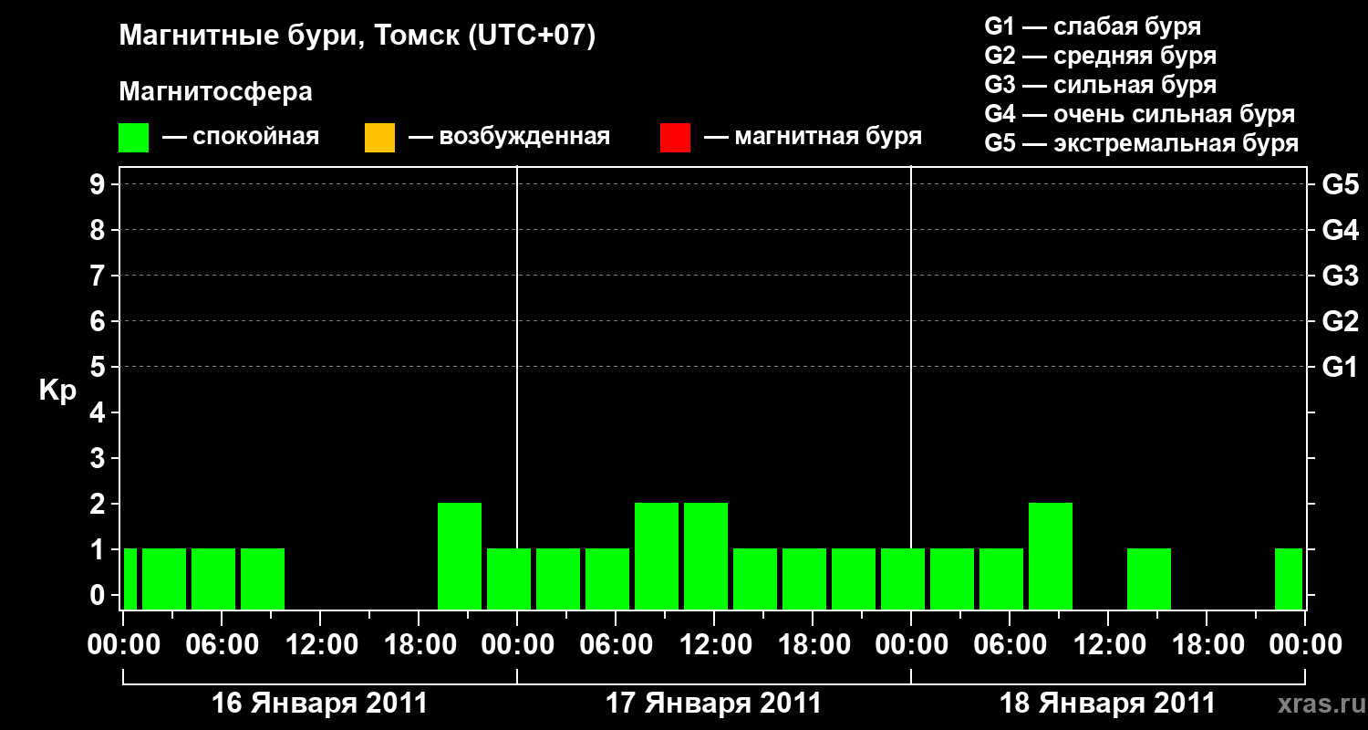 Изменения геомагнитного индекса Kp с 16 по 18 января 2011 года для средних широт
