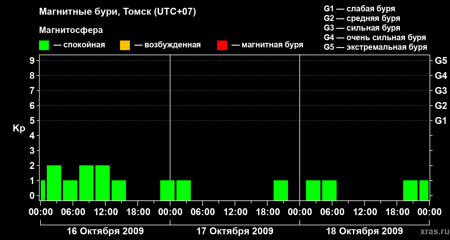Изменения геомагнитного индекса Kp с 16 по 18 октября 2009 года для средних широт