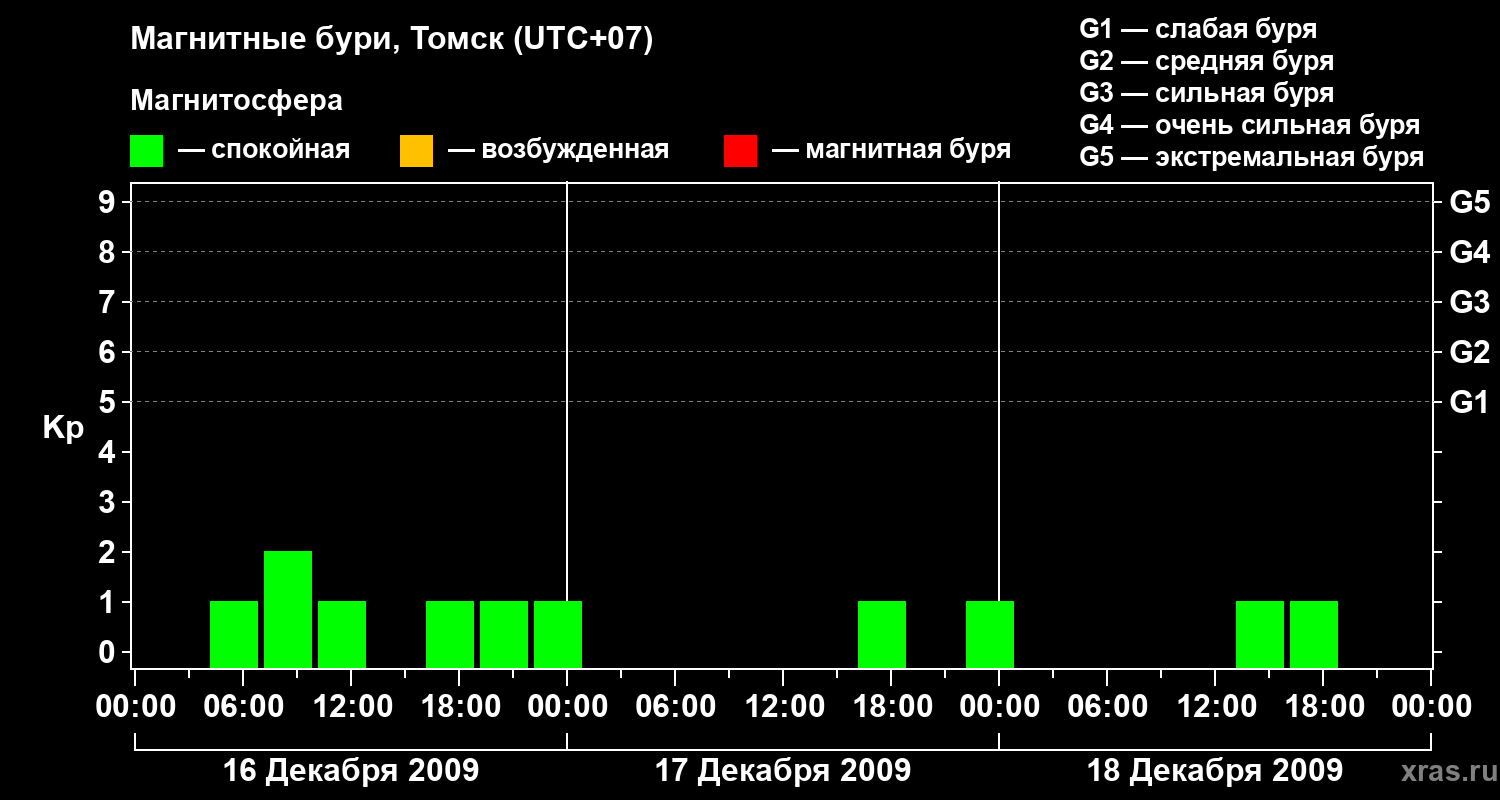 Изменения геомагнитного индекса Kp с 16 по 18 декабря 2009 года для средних широт