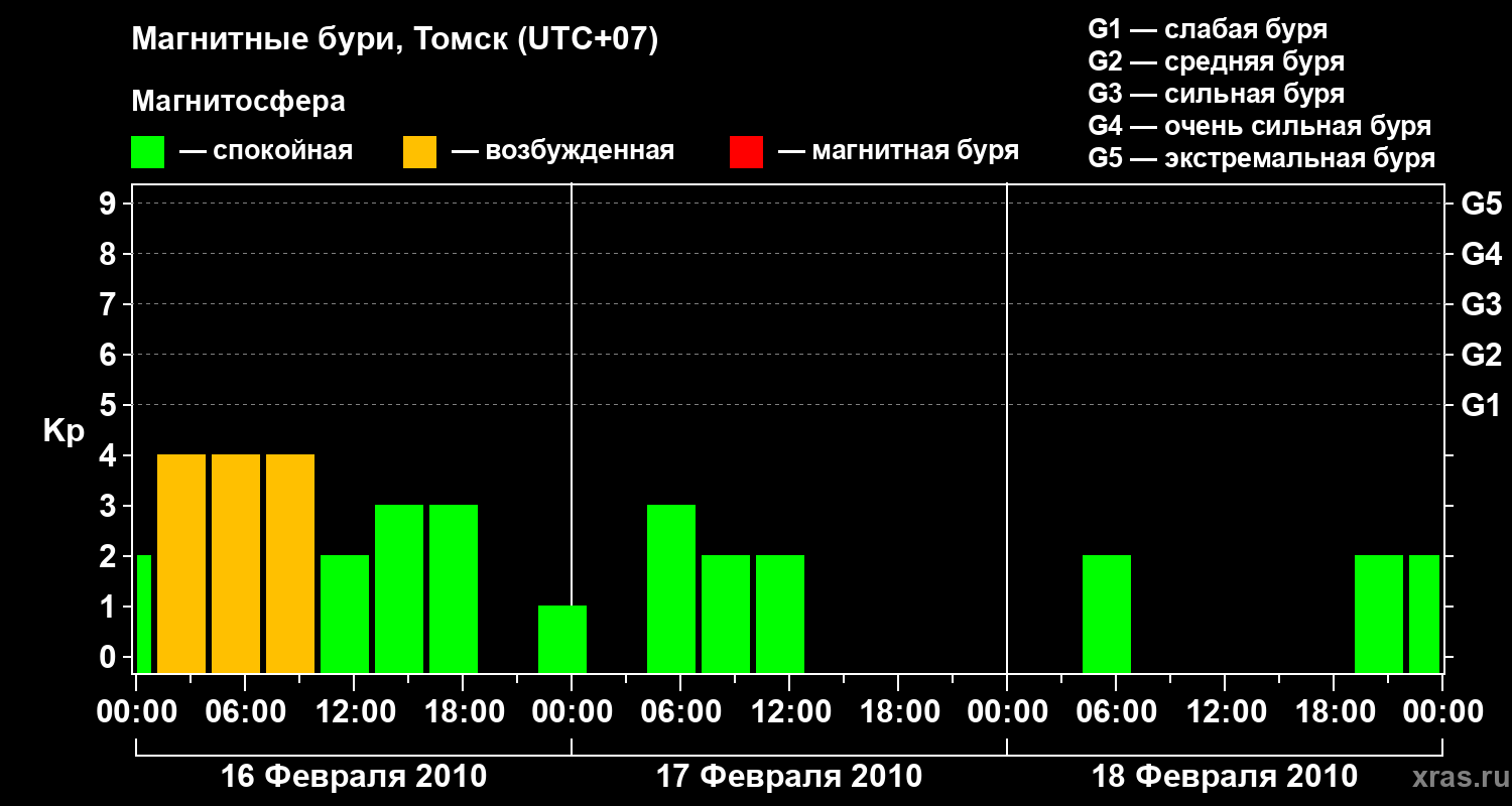 Изменения геомагнитного индекса Kp с 16 по 18 февраля 2010 года для средних широт