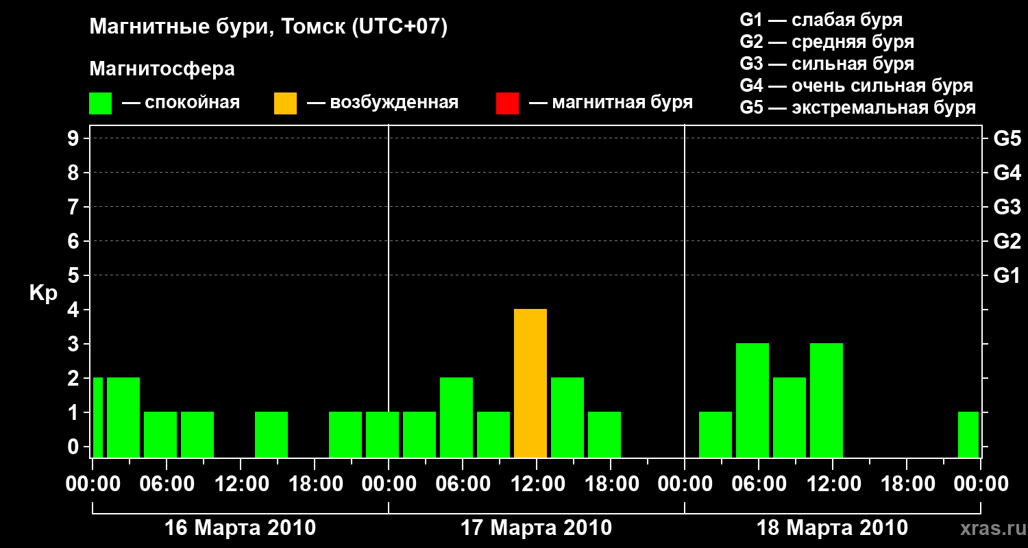 Изменения геомагнитного индекса Kp с 16 по 18 марта 2010 года для средних широт