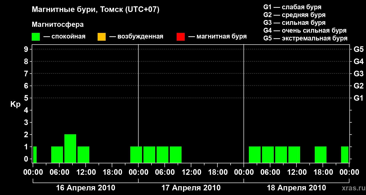 Изменения геомагнитного индекса Kp с 16 по 18 апреля 2010 года для средних широт