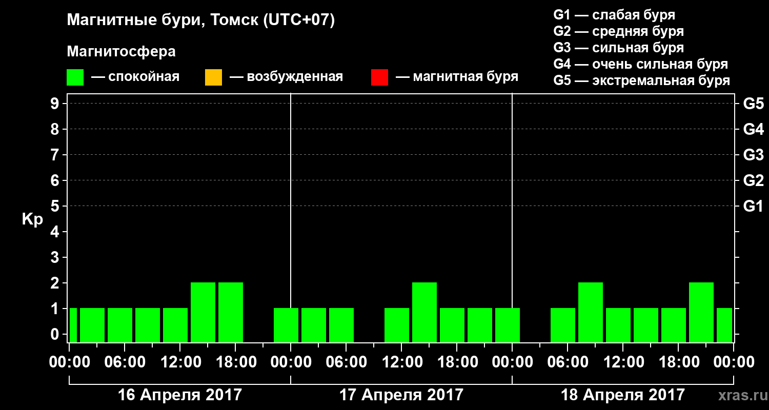 Изменения геомагнитного индекса Kp с 16 по 18 апреля 2017 года для средних широт