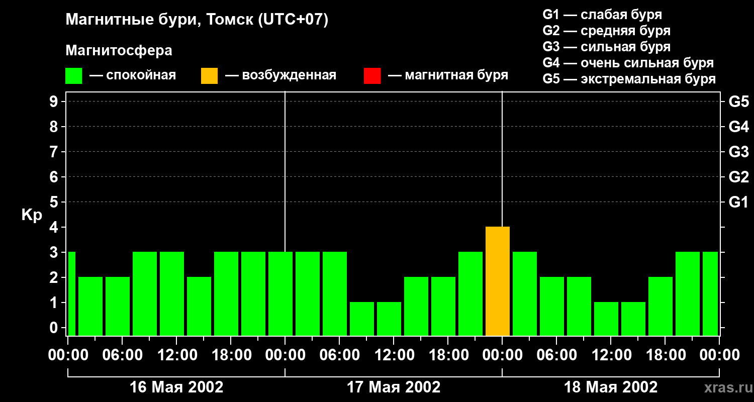 Изменения геомагнитного индекса Kp с 16 по 18 мая 2002 года для средних широт