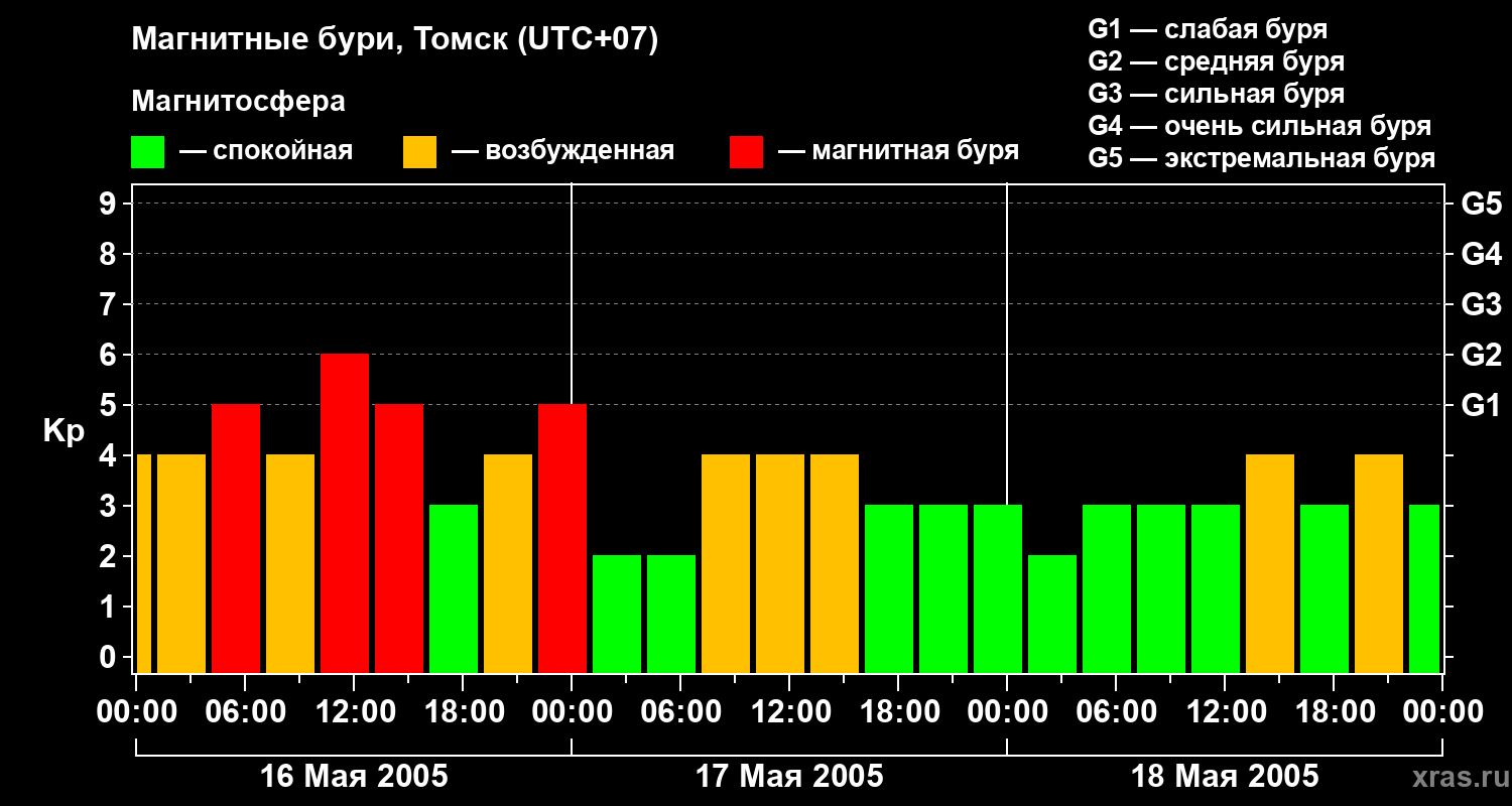 Изменения геомагнитного индекса Kp с 16 по 18 мая 2005 года для средних широт