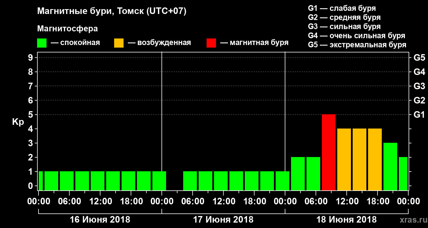 Изменения геомагнитного индекса Kp с 16 по 18 июня 2018 года для средних широт
