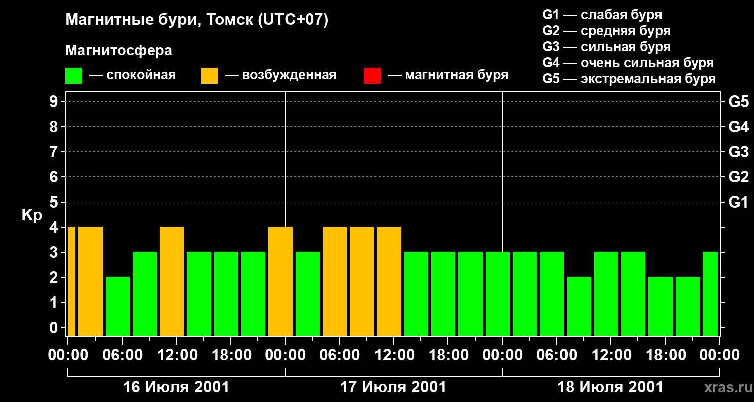 Изменения геомагнитного индекса Kp с 16 по 18 июля 2001 года для средних широт