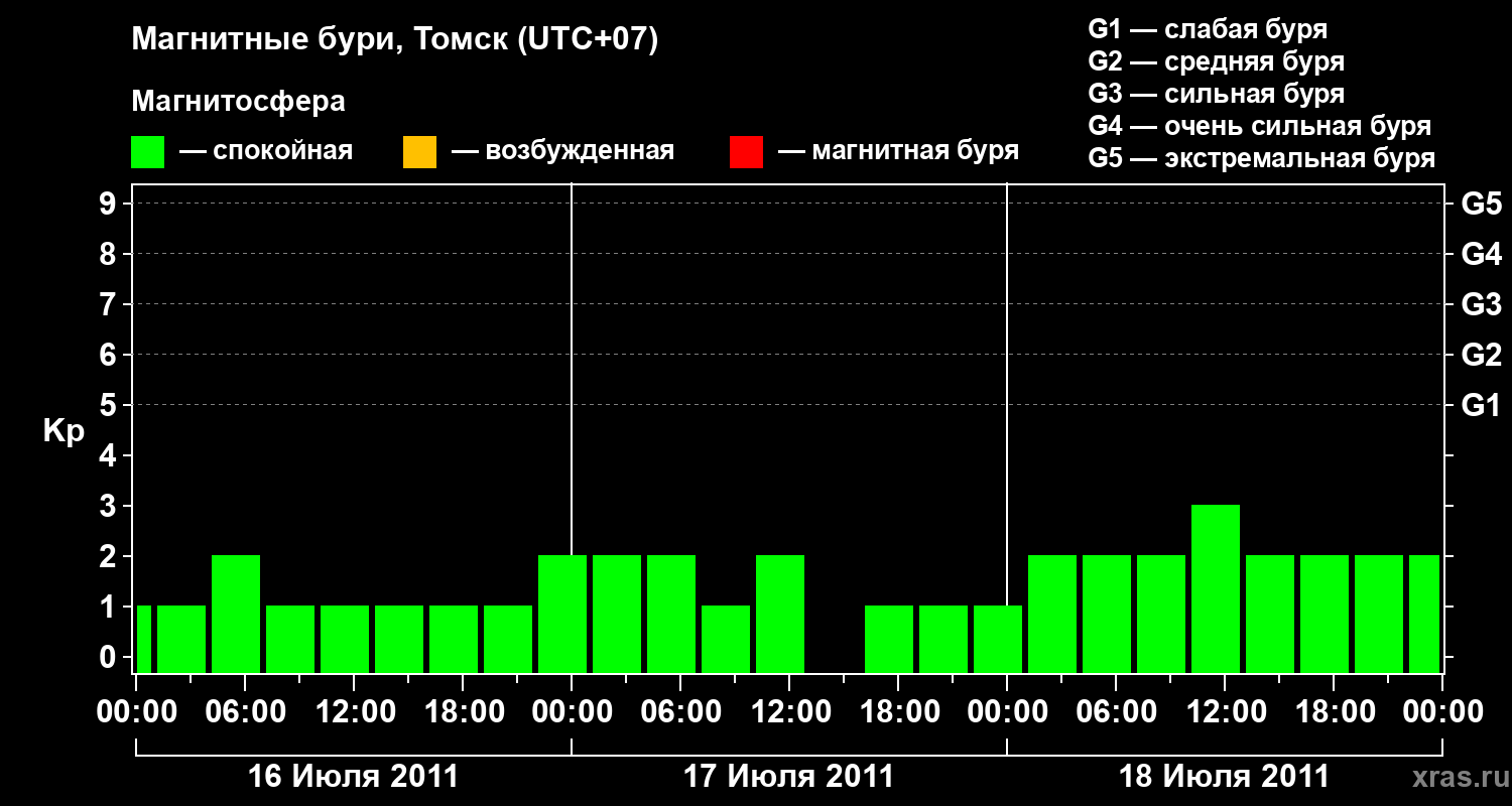 Изменения геомагнитного индекса Kp с 16 по 18 июля 2011 года для средних широт