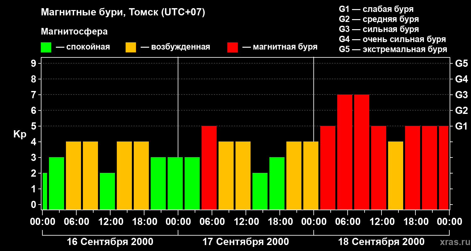 Изменения геомагнитного индекса Kp с 16 по 18 сентября 2000 года для средних широт