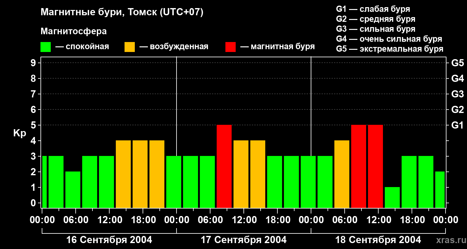 Изменения геомагнитного индекса Kp с 16 по 18 сентября 2004 года для средних широт