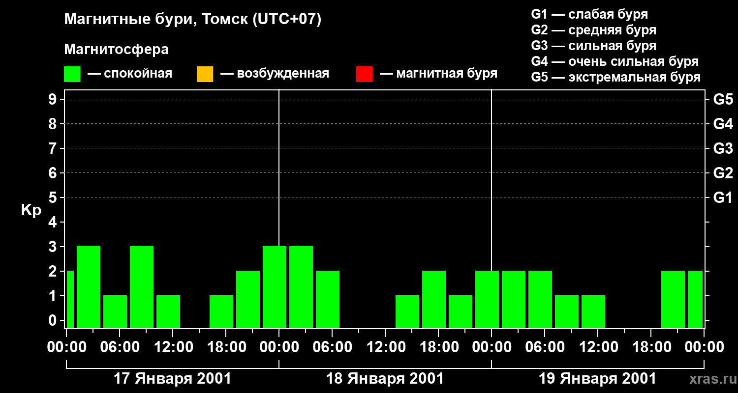 Изменения геомагнитного индекса Kp с 17 по 19 января 2001 года для средних широт