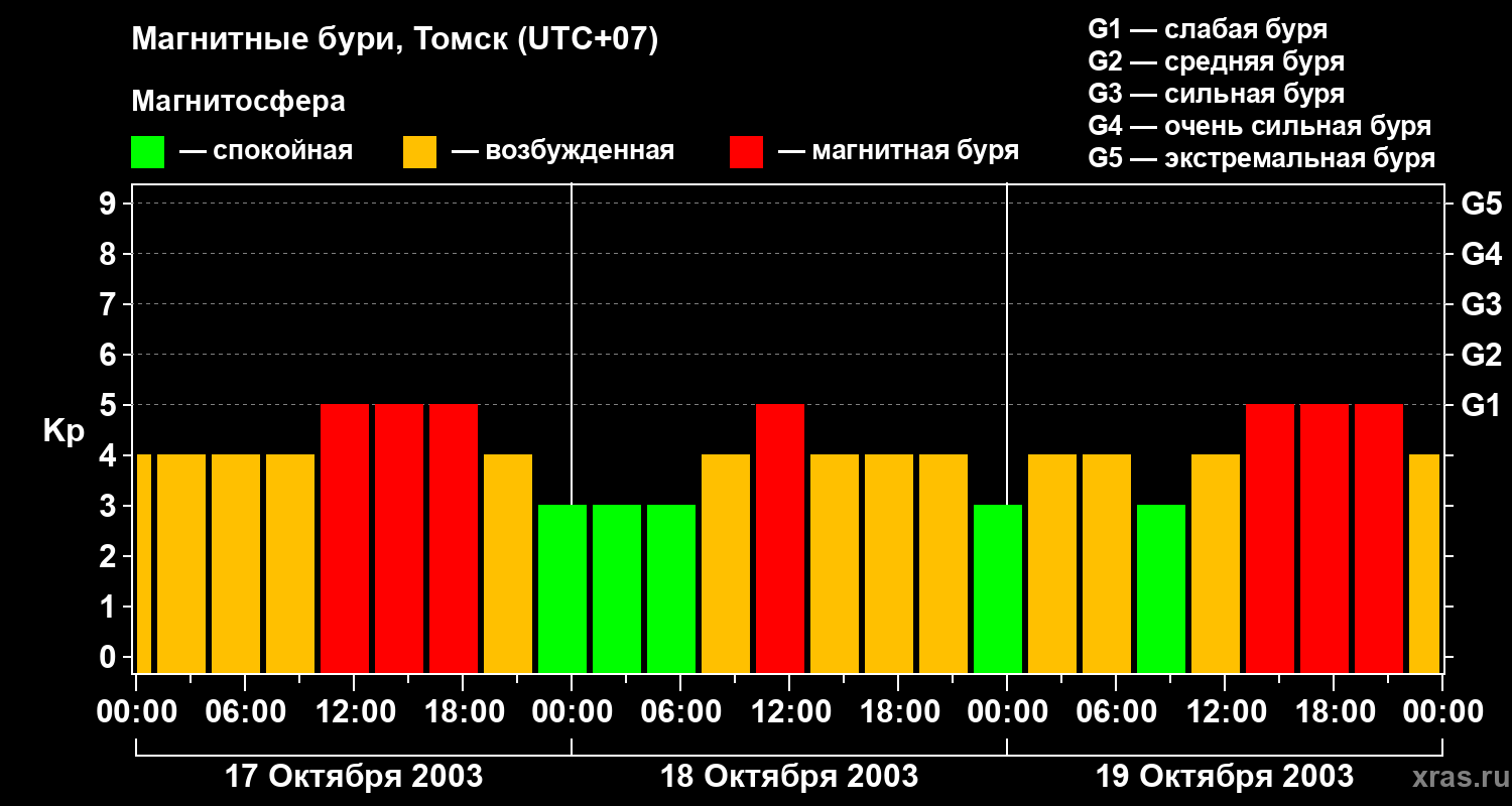 Изменения геомагнитного индекса Kp с 17 по 19 октября 2003 года для средних широт