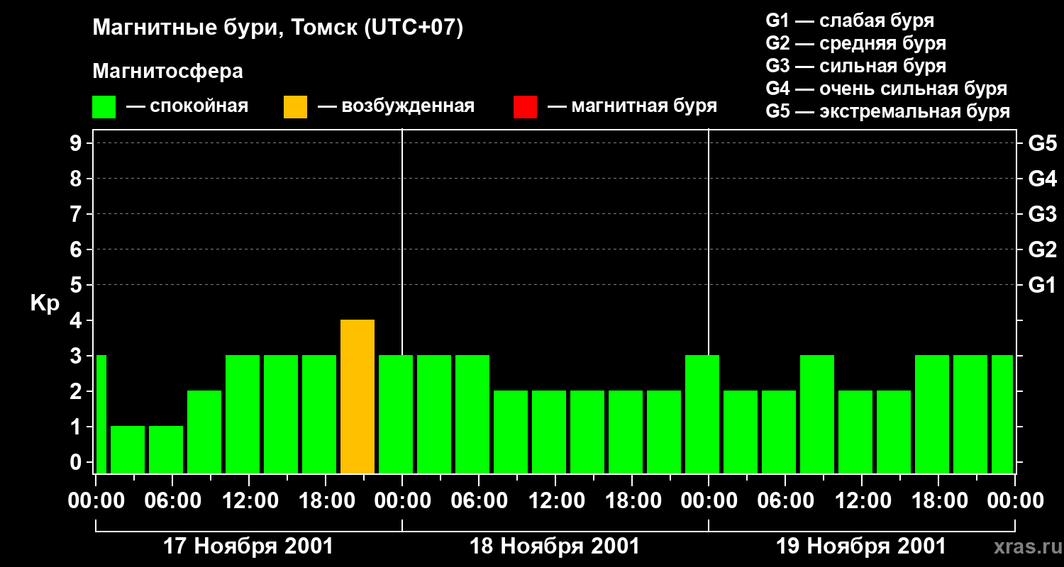 Изменения геомагнитного индекса Kp с 17 по 19 ноября 2001 года для средних широт