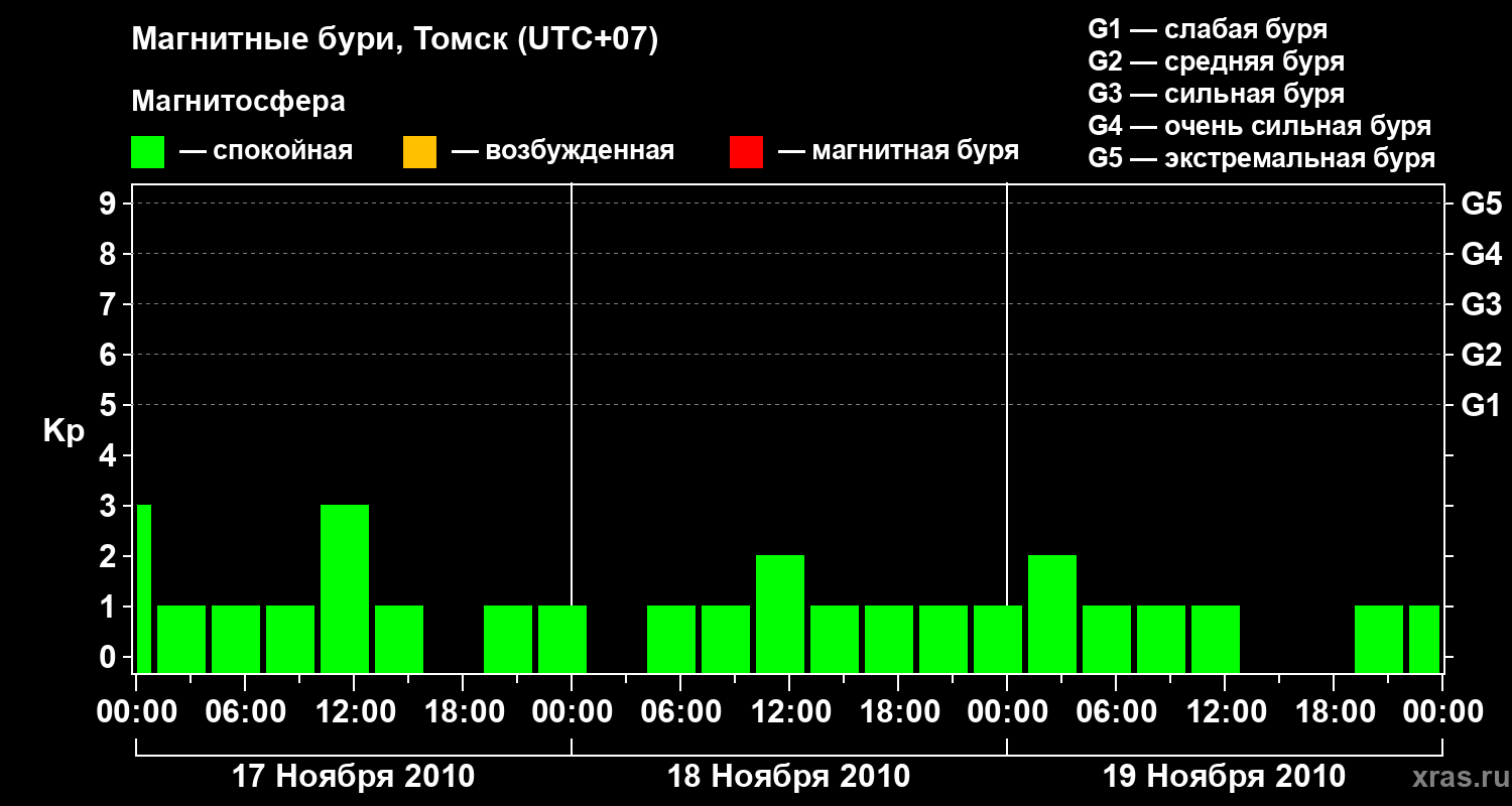 Изменения геомагнитного индекса Kp с 17 по 19 ноября 2010 года для средних широт