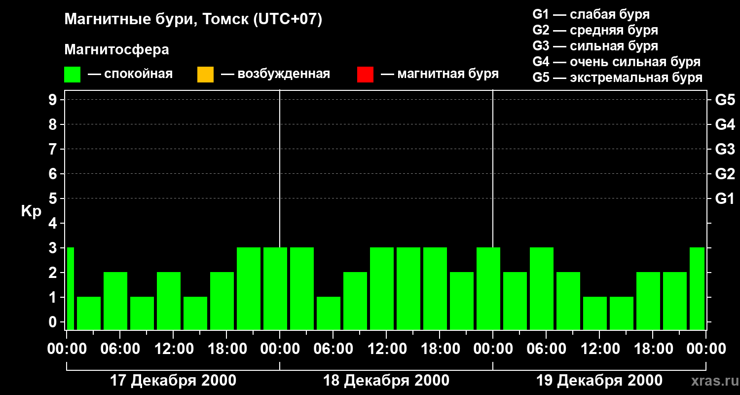 Изменения геомагнитного индекса Kp с 17 по 19 декабря 2000 года для средних широт