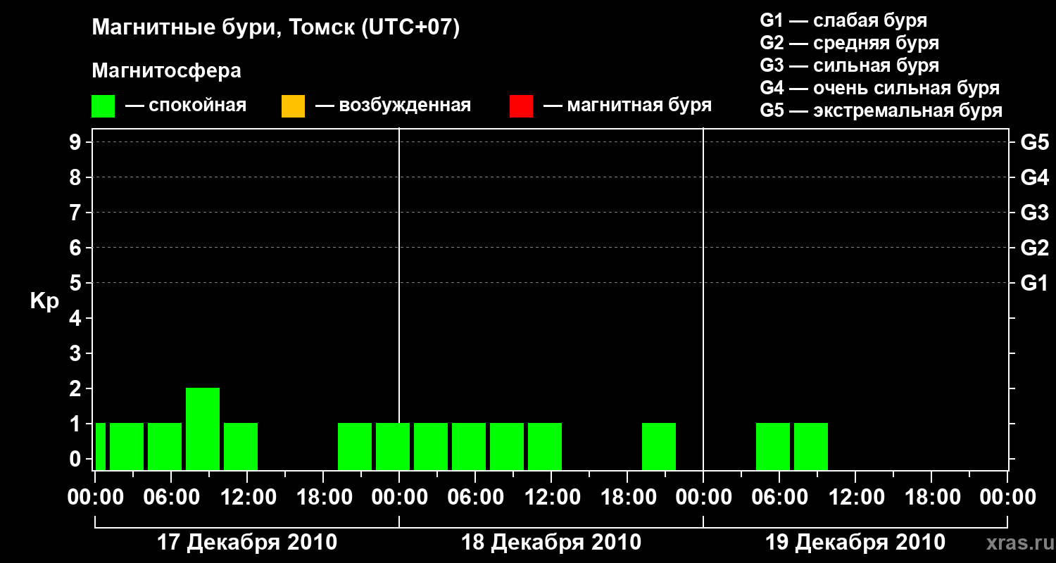 Изменения геомагнитного индекса Kp с 17 по 19 декабря 2010 года для средних широт